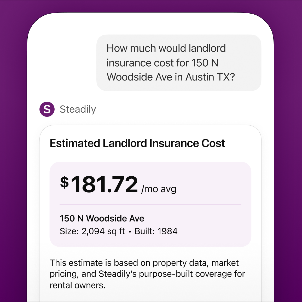 Additionally, a landlord policy costs about 25% more than a homeowner’s policy would on the same property due to the higher risk profile of tenants vs homeowners. The insurance industry has been using the same rating factors and expecting different results for years. Steadily aims to look at underwriting with fresh eyes, and it will track novel risk characteristics in order to better price and accept risk.